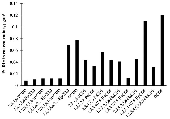 Polychlorinated dibenzo-p-dioxins (PCDDs) and polychlorinated dibenzofurans (PCDFs) (or simply PCDD/F congeners) belong to the group of semi-volatile organic compounds. These compounds are comparatively stable in air (the lifetime ranges between 2 and 20 years [1,2], and can be transported for long distances and/or stored in the ecosystem through a food chain. As a result of a high toxicity, PCDD/F can cause heart problems, disrupt the immune, endocrine system, lead to different forms of cancer, skin rashes [3]. The World Health Organization (WHO) recommends a regular assessment of the impact of air pollutants on the human’s ecosystem and of the health risk associated with human exposure to pollution, as well as an assessment of the trends in exposure duration and the effectiveness of specific management measures (WHO).