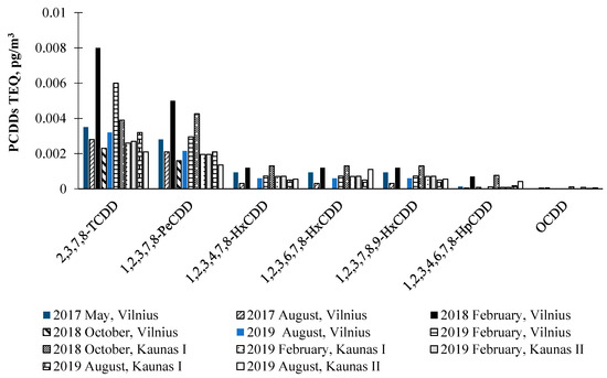 Studies of PCDD congeners revealed that the OCDD compound dominates, but the concentration ratio of 1,2,3,4,6,7,8-HpCDD over OCDD appears to be similar both in Vilnius and Kaunas. In the case of TEQ (see Figure 8), the 2,3,7,8-TCDD compound predominates over 1,2,3,7,8-PeCDD. Their average concentration in total PCDD congeners was about 43% and 32%, respectively, during the warm season, and about 52% and 31%, respectively, during the cold season (in Vilnius), and, accordingly, about 40% and 26%, respectively, during the warm season, and about 36% and 30%, respectively, during the cold season (in Kaunas). According to reference [59] and the conclusions made therein, diesel engine emissions are possibly the main sources of PCDD in Vilnius. A survey by U.S. Environmental Protection Agency (EPA) showed that heavy-duty diesel-engine exhaust was the sixth largest PCDD/F source in the U.S., and accounted for 4.6% of total emissions in 2000 [60,61]. A regional highway is located near the site of our laboratory for measurements, with comparatively intensive traffic (6200 cars/h), which might have affected the results of our measurements. During the measurement period, the mobile vehicle was parked in the parking lot located at S. Žukausko g. 9, Ramučiai, Kaunas district. The nearest highway which might have had some influence on the measurement results is A1 (E85) highway located approx. 1000–1500 m to the south-west. The additional factors that may have had some impact on the measurement results are vehicles travelling along the nearby S.Žukausko street, and emissions from plants and residential houses located in close proximity to the measurement point. Kaunas heat and power plant, as well as a railway logistics hub, are to the south-west of the measurement location. They may also have had an influence on the measurement results.