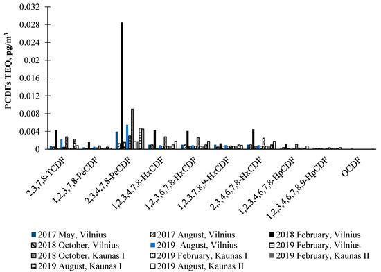 For comparison, 2,3,4,7,8-PeCDF is predominant in PCDF congeners concentration. The obtained average concentrations of 2,3,4,7,8-PeCDF, 1,2,3,4,7,8-HxCDF, 1,2,3,6,7,8-HxCDF, 1,2,3,7,8,9-HxCDF and 2,3,4,6,7,8-HxCDF compounds in Vilnius were equal to 36%, 12%, 12%, 9% and 12% during the warm season, and to 47%, 7%, 11%, 9%, 11% during the cold season, respectively. Whereas, in Kaunas the obtained average concentrations for the same compounds were equal to 38%, 11%, 11%, 8%, and 11% during the warm season and to 36%, 13%, 12%, 10%, and 12% during the cold season, respectively. As we see from Figure 9, the 2,3,4,7,8 PeCDF compound can be considered one of the most important deposits.
