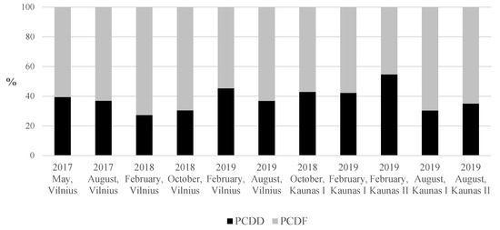 The results (Figure 10) indicate that the contribution of different homologue groups to the PCDD/PCDF ratio depends on the season of the year. It was determined that the toxic equivalent of PCDF compounds in the ambient air sample taken in Vilnius may constitute more than 62% during the warm season and 66% during the cold season, whereas, in the air sample taken in Kaunas, it is equal to 67% during the warm season and 53% during the cold season. For PCDD compounds, this parameter reaches only 38% and 34% (in Vilnius) and 33% and 47% (in Kaunas), respectively. The seasonal effect may be explained by influence of domestic combustion of coal and wood for household heating purposes and emissions from vehicle engines, which are expected to be higher during the cold season. TCDD, for instance, has a half-life of several years, and a very slow metabolism [62,63,64]. These are the most common sources of dioxin-like pollutants in the body [65,66,67].