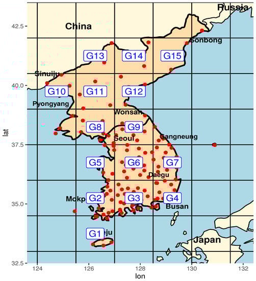 For regridding to common grid points of , the iterative Barnes interpolation scheme [32] was employed for the observations and simulation data from 21 models. The Barnes technique produces a rainfall field on a regular grid from irregularly distributed observed rainfall stations. It has gained large importance in the mesoscale analysis (see, e.g., in [33,34,35]). Figure 1 shows a map of the Korean peninsula, the spatial distribution of 127 rainfall observed stations, and the 15 grid cells used in this study. The observations for the 42-year reference period were obtained from the Korea Meteorological Administration. Table 1 is the list of 21 CMIP6 climate models used in this study.
