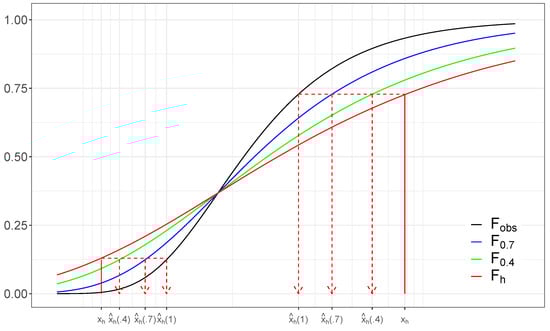 We refer (9) the “-correction” of the historical data to the observations. If , then the -correction is an ordinary QM. If , then no BC is performed for the historical data. A sketch of the method with and is given in Figure 2. Note that is not same as , but the cdf from is equal to for all k. The idea for the -correction was inspired from examining various QM graphs in [48,49].