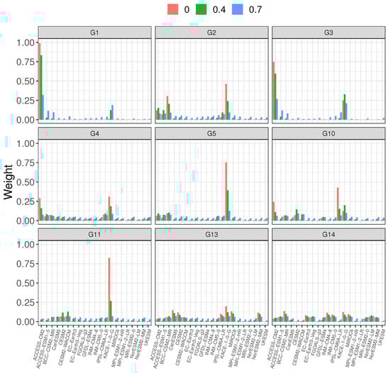 This approach picks each model from a multi-model ensemble in turn and treats it as the true representation of the climate system. The data from this perfect model are treated as true observations, termed as “pseudo-observations”. Then, the -weights are obtained by following the same process presented in the above Section 4.2. Actually, the pseudo-observations from the perfect model and the -corrected historical data for the remaining models are used. This leave-one-model-out method is called a model-as-truth experiment or a perfect model test [27,30]. This allows for an evaluation of the impact of the weighting in the future based on each model representing the truth once.