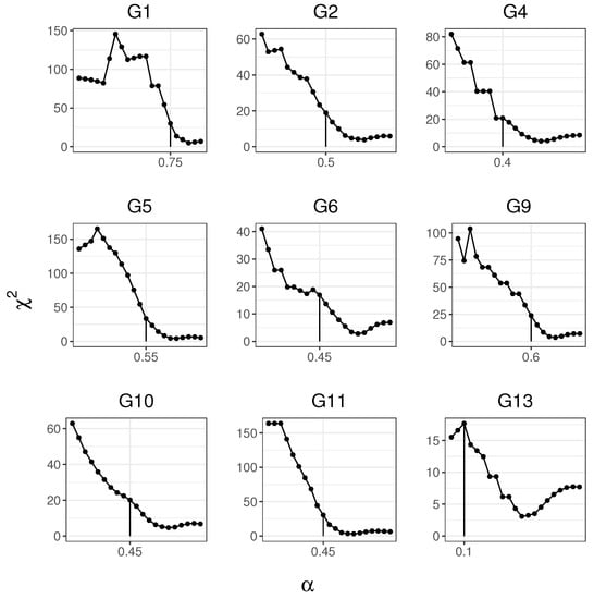 Researchers may want to fix the at one value. For this purpose, two methods applicable to each grid are presented here: The first method is the chi-square statistic for testing the null hypothesis of uniform (or equal) distribution of the weights, where for every k, and we let . Then, for each grid, the chi-square statistic to test the above given by [38]