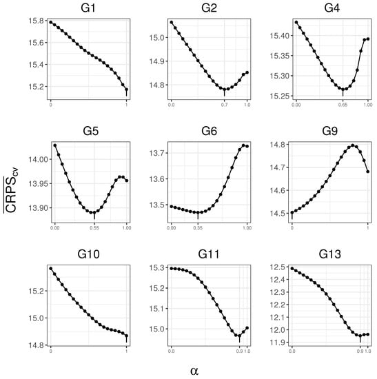 As another way of selecting an optimal , we consider the use of the continuous ranked probability score (CRPS), which can be employed to evaluate the impact of the weighting on the skill of the future projections. The CRPS defined for a single forecast can be extended for multiple occasions by averaging it, which is detailed in [50]. The averaged CRPS can be formulated as a function of -weights, denoted by . In the next section, the leave-one-model-out version is averaged to compute as in Equation (16). Thus, an optimal can be chosen at the minimum of the . These optimal s values, selected differently from each grid, can lead to an increase in skill while minimizing the probability of overfitting [27]. In selecting an appropriate , one can consider other criterion such as entropy [19] or the cross-validated mean squared error.