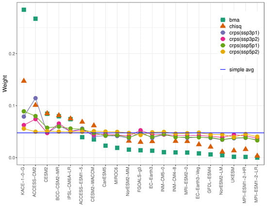 The results from Figure 7, Figure 8 and Figure 9 show the differences due to the weighting schemes, but the differences may not be as distinctive as they appear. Because the results from the weighted and unweighted means are similar, one may question why the simple average could not be used. Lorenz et al. [29] argued that although the resulting numbers may be similar, the interpretation of the spread is different between the unweighted and the weighted multi-model means. In that paper, they wrote the following. “The spread of the simple average is just a spread and is not a measure of uncertainty. It is an ad hoc measure of spread reflecting the ensemble design, or lack thereof, whereas the spread in the weighted multi-model mean can be interpreted as a measure of uncertainty given everything we know. We thus should have more confidence in the latter”.