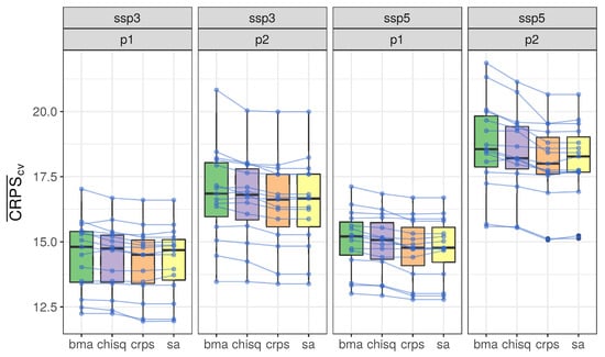 Parallel coordinated box-plots of defined as in Equation (16), over 15 grid cells obtained from various -weighting methods based on Bayesian model averaging (BMA), chi-square statistic (chisq), the continuous rank probability score (), and the simple averaging (sa) for the future periods P1 (2021–2060) and P2 (2061–2100) under the SSP3 and SSP5 scenarios.