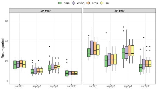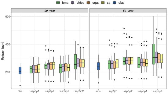 Figure 8 shows schematic box-plots of the 20- and 50-year return levels of the annual maximum daily precipitation for 15 grid cells over the Korean peninsula obtained from various -weights based on the BMA, the chi-square statistic, the , and the simple averaging (SA). Compared to the observations, the return levels for all cases increase in the future; more in P2 and the SSP5 scenario than in P1 and the SSP3, respectively. Figure 9 depicts the similar plots as Figure 8 but for 20- and 50-year return periods (i.e., waiting time) relative to the observations from 1973 to 2014.