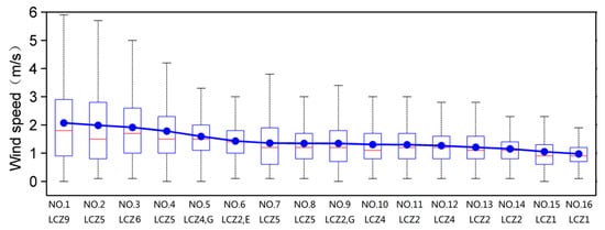 Mean wind speed at the 16 stations is compared in this subsection in order to analyse the LCZ ventilation performance. Figure 3 demonstrates the annual mean wind speed at the 16 stations and the LCZ ventilation performance sequence (original data given in Table S2). The wind speed at stations of No.1, No.2, No.3 and No.4 was high (above 1.9 m/s), higher than the wind speed at the remaining 12 stations. The four stations (e.g., No.1, No.2, No.3, No.4) were located near the city boundary (the black line given in Figure 2). The peripheral locations with low construction levels indicate that the approaching wind was less affected by the urban structures compared with the remaining 12 stations approaching the city centre more. The four stations had LCZ types of LCZ-9, LCZ-5, LCZ-6 and LCZ-5 (Table 1). The sparse and open morphologies were another cause of the higher wind speed at the four stations, compared with the compact morphologies the remaining 12 stations had. LCZ ventilation performance was ranked according to annual mean wind speed at the 16 stations (Figure 3). The results indicate that the wind speed decreased with the weather stations from No.1 to No.16. This indicates that the LCZ ventilation performance decreased with the LCZ types following the order of sparse, open low-rise, open midrise and compact midrise. Such consistent relationships between wind speed and LCZ types confirm the reliability of using the LCZ classification scheme to indicate the local-scale urban ventilation performance.