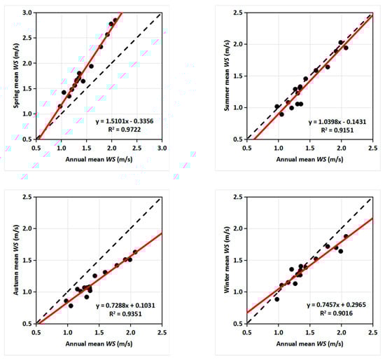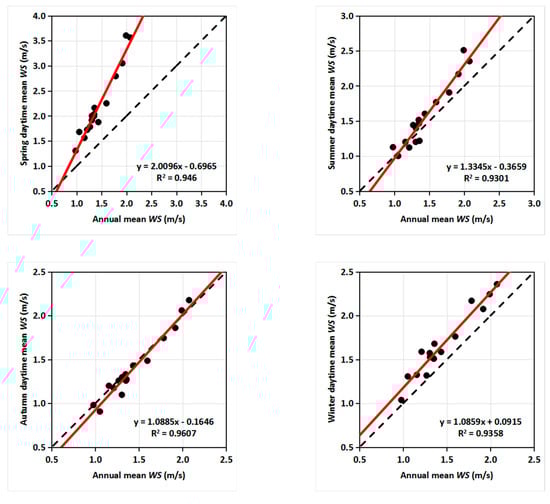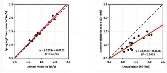 Figure 4 exhibits seasonal mean wind speed and LCZ ventilation performance sequence through the spatial correlation coefficient (η, or R2) (also refer to Table S3). First, the fitted line of spring wind speed (Figure 4) was above the reference line (1:1, annual wind speed), indicating the spring wind speed was higher than the annual scenario. The autumn wind speed was much lower, and summer and winter wind speeds were similar to the annual wind speed. This result indicates the seasonal variation in LCZ ventilation performance.