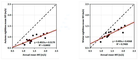 Figure 5 and Figure 6 present the diurnal and nocturnal mean wind speed and LCZ ventilation performance sequence in four seasons, respectively (also refer to Tables S4 and S5). The fitted line of spring diurnal wind speed was above the reference line (1:1, annual wind speed), indicating the stronger spring wind environment in Shenyang. The winter diurnal wind was also stronger than annual scenario, the summer diurnal wind was similar to the annual scenario and the autumn diurnal wind was weaker than the annual scenario. This result indicates the seasonal variation in diurnal LCZ ventilation performance.