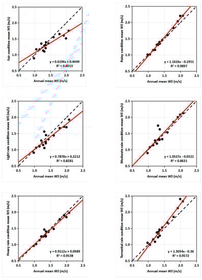 Figure 7 demonstrates mean wind speed and LCZ ventilation performance sequence under different precipitation conditions. First, the fitted line of wind speed under no precipitation condition was below the reference line (1:1, annual wind speed), indicating the wind under no precipitation condition was weaker. The wind under precipitation condition was stronger than the annual scenario. Moreover, LCZ classification scheme could also indicate local-scale urban ventilation performance, with the R2 of 0.99 and 0.80 under precipitation and no precipitation conditions, respectively. Moreover, under light, moderate, heavy and torrential rain conditions, mean wind speeds were generally similar to the annual wind speed, as fitted lines roughly coincided with the reference line (1:1, annual wind speed). Under these rain conditions, the LCZ classification scheme was also robust to indicate local-scale urban ventilation performance with the R2 of 0.83, 0.86, 0.95 and 0.96, respectively (Figure 7).