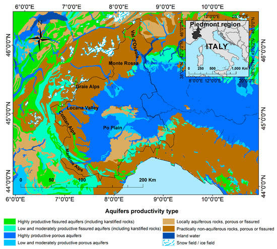 Regarding the orography of the Piedmont region, the relief is distributed similar to an amphitheater, with high elevations in the north, west, and south, whereas the central and east parts are more occupied by plains. Because of these characteristics, the surface water flow converges over the east, where the main river collector is the Po. Groundwater flow and storage, and also groundwater vulnerability are related to the aquifers and climate. The aquifers characteristics are based on geological composition. In the mountain areas, there are predominantly the karstified limestones, marlstones, calystones, and also conglomerates. In the lowlands, the porous aquifers are composed of mainly gravels and sands. In a few locations, aquifers with volcanic and schists can be identified. Supplementary Material Figure S1 depicts the geological formations of the Piedmont region. The productivity of each aquifer type has been classified into the following six categories: highly productive fissured aquifers, highly productive porous aquifers, low and moderately productive fissured aquifers, low and moderately productive porous aquifers, locally aquiferous rocks (porous or fissured), practically non-aquiferous (porous or fissured) (Figure 1).