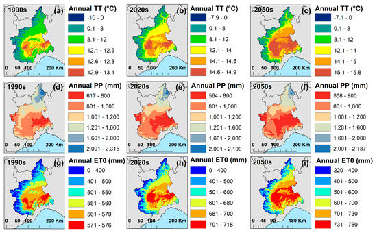 Spatial distribution of temperature, precipitation, and potential evapotranspiration (ET0) in the Piedmont region. (a) The average of the mean annual air temperature between 1960 and 1990 (1990s); (b) The average of the mean annual air temperature between 2011 and 2040 (2020s); (c) The average of the mean annual air temperature between 2041 and 2070 (2050s); (d) The average of the mean annual precipitation between 1960 and 1990 (1990s); (e) The average of the mean annual precipitation between 2011 and 2040 (2020s); (f) The average of the mean annual precipitation between 2041 and 2070 (2050s); (g) The average of the annual ET0 between 1960 and 1990 (1990s); (h) The average of the annual ET0 between 2011 and 2040 (2020s); (i) The average of annual ET0 between 2041 and 2070 (2050s). Source Nistor et al. (2019).