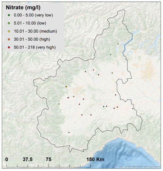 During 2005–2012, NO3 and other chemical elements were monitored at 39 surface and groundwater stations in the Piedmont region. The values and locations of this data are available on the European Environment Agency website. Following the ”Guidelines for Drinking Water Quality” [52], a limit of 50 mg/L of NO3 for very high concentrations in the drinking water was admitted. In the Piedmont region, the NO3 values ranged from 0 to 218 mg/L (Figure 4). A study by [28] used NO3 data to verify the methods of groundwater vulnerability mapping in various areas from Piedmont region.
