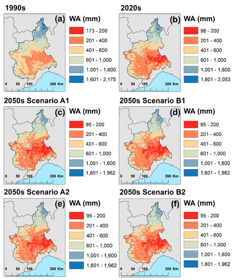 Spatial distribution of water availability (WA) in the Piedmont region. (a) WA related to the present period (2020s); (b) WA related to the future period (2050s), Scenario A1; (c) WA related to the future period (2050s), Scenario B1; (d) WA related to the future period (2050s), Scenario A2; (e) WA related to the future period (2050s), Scenario B2. Source: Nistor et al. (2019).