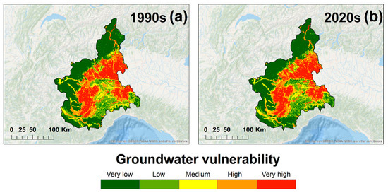 The spatial analysis by weights was generated using water availability, vulnerability factor, PLI, and infiltration map layers. These parameters represent the main factors that influence the groundwater vulnerability due to climate conditions, land cover aspects, terrain morphology, and geology of the area. Figure 6 shows the map of groundwater vulnerability in the Piedmont region for the past and present periods (1990s and 2020s). The Po Plain and eastern sides of the region represent the territory where there is a very high and high vulnerability of groundwater under climate and land cover. A medium vulnerability class extends, for both periods, in the central, south-west, and north-central parts of the Piedmont region. A low and very low vulnerability extend mainly in the peripheral parts of the region and in some locations from the central part. Interestingly, between the 1990s and 2020s periods, a very high vulnerability class occupies a larger territory in the second period, while the very low class is reduced.