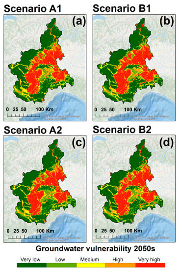 Future scenarios of groundwater vulnerability in the Piedmont region indicate a high and very high vulnerability class in the south-west and east parts, in all scenarios. A very low class was depicted in the north of the Piedmont region, whereas a low class extends mainly in the south and west. There were a few locations of low vulnerability class identified in the north and central parts. A medium class of groundwater vulnerability could be found in the south-west, north-central, central, and east parts of the study area. The spatial distribution of the groundwater vulnerability pattern is very similar in all four scenarios. We note that very high class of vulnerability increased in the area, and high and medium classes of vulnerability decreased in the area. A very low class of vulnerability also increased, during the 2050s period, in the south of the Piedmont region as a consequence of the forest presence in that area by mid-century. Future scenarios of groundwater vulnerability for the Piedmont region are depicted in Figure 7.