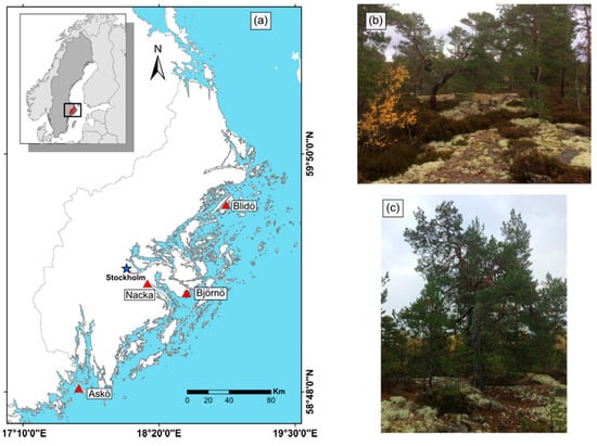 The study area ranges between 58°49′–59°39′ N and 17°38′–18°34′ E in the Stockholm archipelago, located on the east coast of Sweden (Figure 1). The annual mean temperature in the region is 6.6 °C (Stockholm meteorological station, period 1981–2010). February, in general, is the coldest month with a mean temperature of −3.0 °C and July the warmest with a mean temperature of 17.2 °C. The mean annual precipitation is 539 mm with peak rainfall occurring in July and August, and the length of the growing season is 180 days (Swedish Meteorological and Hydrological Institute, SMHI). Additionally, summer precipitation (May–July) was found to be inversely related to temperature (r = −0.35; p < 0.01). The vegetation belongs to the boreonemoral zone, characterized by mixed forests, including P. sylvestris, Picea abies, Quercus robur, Betula pendula, and Populus tremula []. The isostatic uplift in the region (4 mm/year) creates a peculiar type of forest known as flat rock forests (Sw: Hällmarksskog). As new land surfaces are exposed to rebound wave action barren bedrock outcrops are left behind. In time, as uplift progresses and these new islands rise above the wave action, they begin to accumulate a very thin layer of dry, nutrient-poor soil, that can support a thin cover of vegetation consisting mainly of mosses and lichen, and slow-growing pine trees emerging from soil-filled cracks in the bedrock. These island forests are not easily accessible and have low economic value. Consequently, the trees can be several hundred years old.