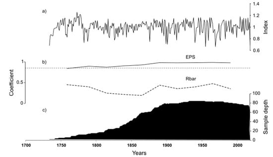 Although requiring fewer samples to produce robust paleoclimatic reconstructions, a decrease in variance was observed between ca. 1800 and 1870 in the MXD data, likely due to a lower coherence between the density series, as shown by the EPS and Rbar statistics (Figure 2). It is important to highlight that the period between 1806 and 1835 is reported as one of the longest continuous droughts in the region [], and the lower agreement between the series may be caused by the experienced physiological stress.