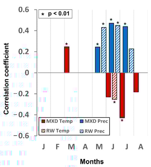 Bootstrap correlation of MXD and tree-ring width (TRW) chronologies against the climatic data from the Stockholm meteorological station (temperature in red, precipitation in blue) for the 1895–2018 period. Correlations shown are significant at p < 0.05 and p < 0.01.