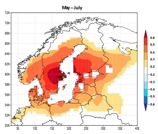 The final MXD reconstruction from the archipelago can explain 41% of the total variance in the instrumental May–July precipitation data from Stockholm, which is an improvement in comparison to the 30% (May–June) in Linderholm et al. []. In 2013, Seftigen et al. [] presented a more robust result by using a network of moisture-sensitive chronologies calibrated against standardized precipitation index (SPI), capturing 41.6% of the total variance in the instrumental data, however, with a shorter response window (June–July).