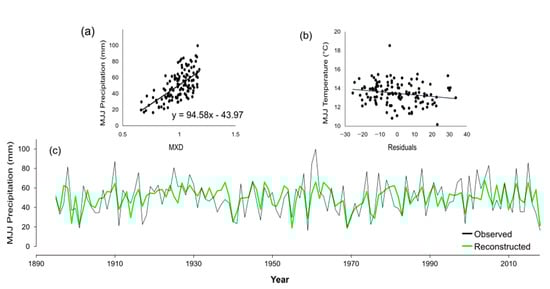 Based on the climate-sensitivity analysis, a transfer function using a linear regression model was developed to estimate May–July precipitation. The regression equation obtained for the period 1985–2018 was P MJJ(t) = −43.9 + 94.5MXD(t). The calibration and verification of split period statistics confirm the reliability of the model to predict the observed summer precipitation variability. The positive CE and RE statistics indicate the strength of the model. A weak negative (r ≈ −0.2, p < 0.05) correlation was found between the regression residuals and May–July temperature. The calibration and verification statistics are shown in Table 2. The final reconstruction model accounted for 41% of the variance in the instrumental May–July precipitation (Figure 5). The full reconstruction contained 41 dry (<41 mm) and 40 wet (>61 mm) years, out of which 18 dry and 19 wet were recorded in pre-instrumental years (1750–1894) (Figure 6).