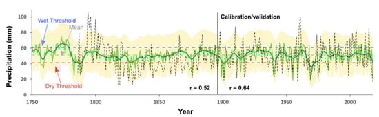 Comparison between the Stockholm instrumental record (dashed black) and reconstructed (light green) mean May-July precipitation from the archipelago pines, composite MXD chronology with respective correlation coefficients. Green bold line represents the 10-year-low-pass Gaussian filter. Yellow shading indicates the chronology uncertainty (2 ± the standard errors). Dry years were classified as instrumental values falling below the 15th percentile threshold (<41 mm), and wet years were those that rise above the 85th percentile threshold (>61 mm).