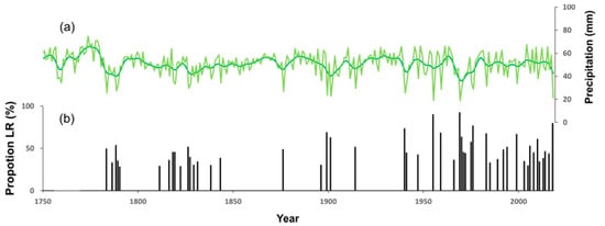 (a) Reconstructed May–July precipitation and (b) regional light ring (LR) chronology developed from Scots pine trees growing in the Stockholm archipelago. The proportion of LR present in >30% of the samples (black bars).