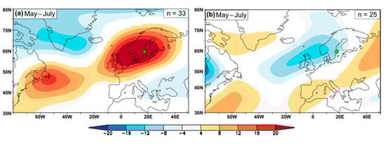 Atmospheric synoptic conditions during light ring years (Figure 8a) resembled the pattern as described for the positive phase of the summer North Atlantic Oscillation (SNAO); a dipole pressure field further characterized by warm and dry conditions over northern Europe and cold anomalies over Greenland []. In contrast, during reconstructed wet years (Figure 8b), synoptic conditions resembled the negative phase of the SNAO, where a southward displacement of the main storm track leads to increased precipitation and cooler conditions over the British Isles and southern Scandinavia [,]. This analysis highlights the influence of large-scale circulation patterns on Scandinavian regional climate.