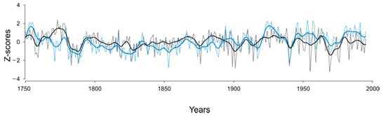 To set the chronology into a spatial context, it was compared against the TRW hydroclimate (SPEI) reconstruction from Scandinavia (ScandH17) []. Despite the different seasonal target and slightly different calibration period (i.e., 1901–1995), correlations over the common period 1750–2018 point to a good coherence between the records on the interannual timescale (r = 0.48, n = 246, p < 0.01) (Figure 9). However, the MXD chronology seemed to capture better the severity of the extreme precipitation deficits than the TRW ScandH17 chronology. Similar findings were reported by Esper et al. [] for temperature cooling estimates of post-volcanic eruptions. Another interesting observation is the increased variability displayed by the MXD data from ca. 1940 CE onwards. Analysis of the precipitation record from Stockholm showed that, during the 2nd half of the 20th century, dry and wet summers were not only more frequent but also more interspersed. The biological memory imprinted in the TRW data, reflecting previous year conditions [,], may reduce the ability of this proxy to represent interannual variability, suggesting a better fitting of the MXD data as a proxy for short-term climatic variations []. On the interdecadal timescale, similarities among the records were more pronounced during dry periods. The largest discrepancy in the reconstructions was found between 1768 and 1777 CE. The narrow seasonal target, together with the slightly different calibration period (i.e., 1901–1995), may explain the overall higher mean of the ScandH17 in the 20th century.