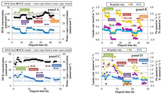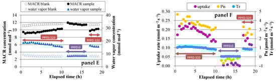 Daytime changes in the uptake rate of MVK or MACR, net photosynthetic rate (Pn), and transpiration rate (Tr) were similar to each other (Figure 1, panel B,D,F). These values were likely to be higher at higher PPFD. During dark periods, the calculated uptake rate was very low (<0.03 nmol m−2·s−1 in most cases), and Pn had negative values because of dark respiration.