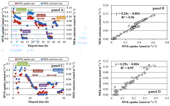 Time course of exchange rates of VOCs and their relationship. Panels A and B: MVK fumigation experiment using Spathiphyllum clevelandii; panels C and D: MVK fumigation experiment using Quercus acutissima.