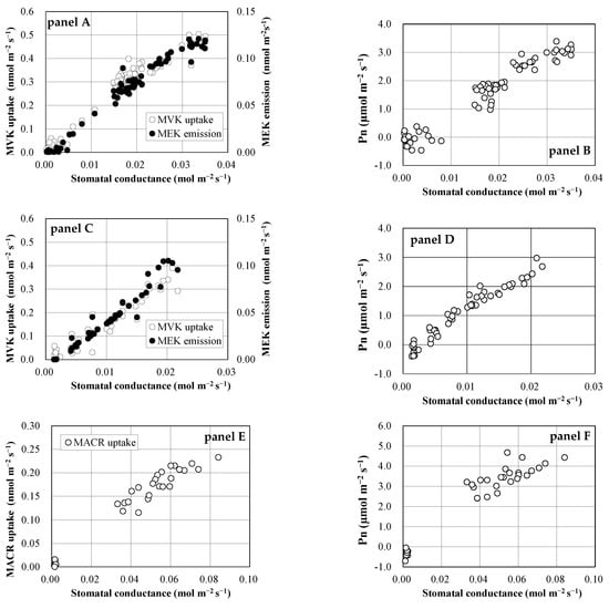 Relationship of exchange rates of VOCs and net photosynthetic rate (Pn) to stomatal conductance. Panels A and B: MVK fumigation experiment using Spathiphyllum clevelandii; panels C and D: MVK fumigation experiment using Quercus acutissima; panels E and F: MACR fumigation experiment using Quercus myrsinifolia.