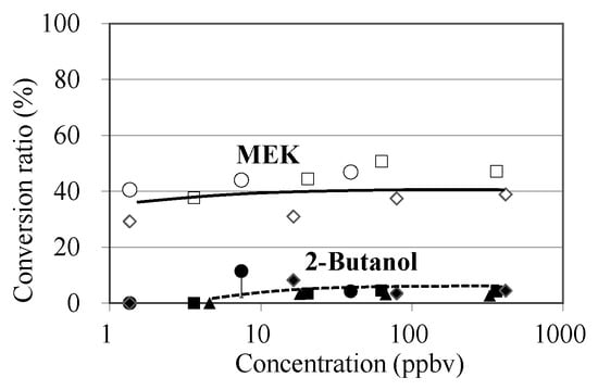 Concentration-dependency of MVK conversions to MEK and 2-butanol. Open and filled symbols indicate conversion ratios from MVK to MEK and to 2-butanol, respectively. Circle, square, and triangle symbols show the 1st, 2nd, and 3rd experiments, respectively. The GC-MS analysis was conducted in triplicate for the air collected into the adsorbent tubes, and standard deviations were all less than 30% of each plotted data point.