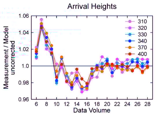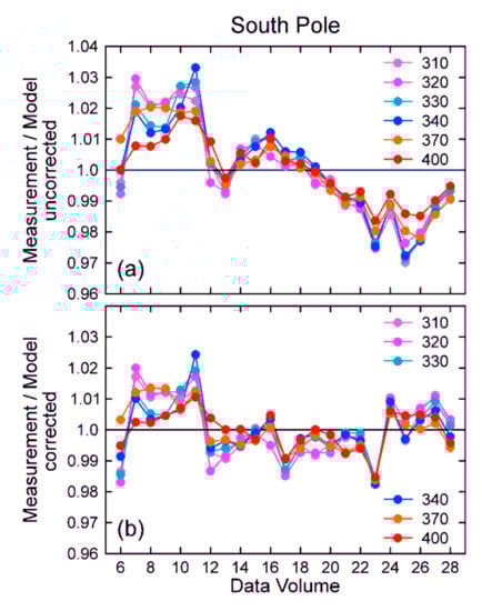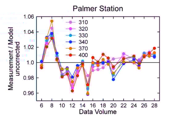 To determine whether the variations shown in Figure 1a could be explained with drifts in calibrations, we corrected the results by taking into account the change in the SoSI from the CUCF lamps to lamp F-616 (red line in Figure A3) plus the other adjustments described in Section 2.5. The corrected median ratios are shown in Figure 1b. The decreasing trend between Volumes 16 and 26 disappeared after applying these corrections, and the median ratios of all volumes now agree to within ±2.2% at all wavelengths. However, the differences between the measurement and model are still not randomly distributed: ratios for Volumes 7–11 are biased high by approximately 1%, while those of Volumes 12–23 are biased low by about 0.5%, and those of Volumes 24–28 are biased high by 0.5%. While we cannot explain the small step changes between Volumes 11 and 12 and Volumes 23 and 24, we note that the remaining variability, including these step changes, is well within the expanded (k = 2) calibration uncertainty of 5.8% calculated by Bernhard et al. []. Thus, the model-based approach provides strong evidence that the corrections described in Section 2.4 and Section 2.5 were appropriate.