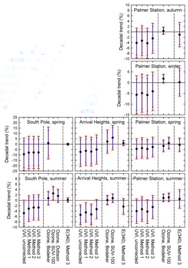 Trends in UVI are generally most significant for January and February. At the South Pole, significant decadal trends of −3.9% and −3.1% were calculated for the two months, respectively, and these can mostly be explained by concomitant trends in TOC measured by the SUV-100 of 3.1% and 2.4%. These upward trends in TOC are corroborated by measurements of a collocated Dobson spectrophotometer; however, the trends in TOCs calculated from the dataset by Bodeker used by McKenzie et al. [] are considerably smaller for reasons that are not yet understood.