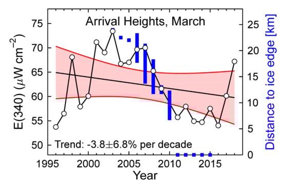 - The irradiance at 340 nm, E(340), changes by −4.7% per decade in February and −2.3% in summer. The trend for February is almost significant at the 90% level. These changes are likely caused by variations in sea ice conditions (Section 4).