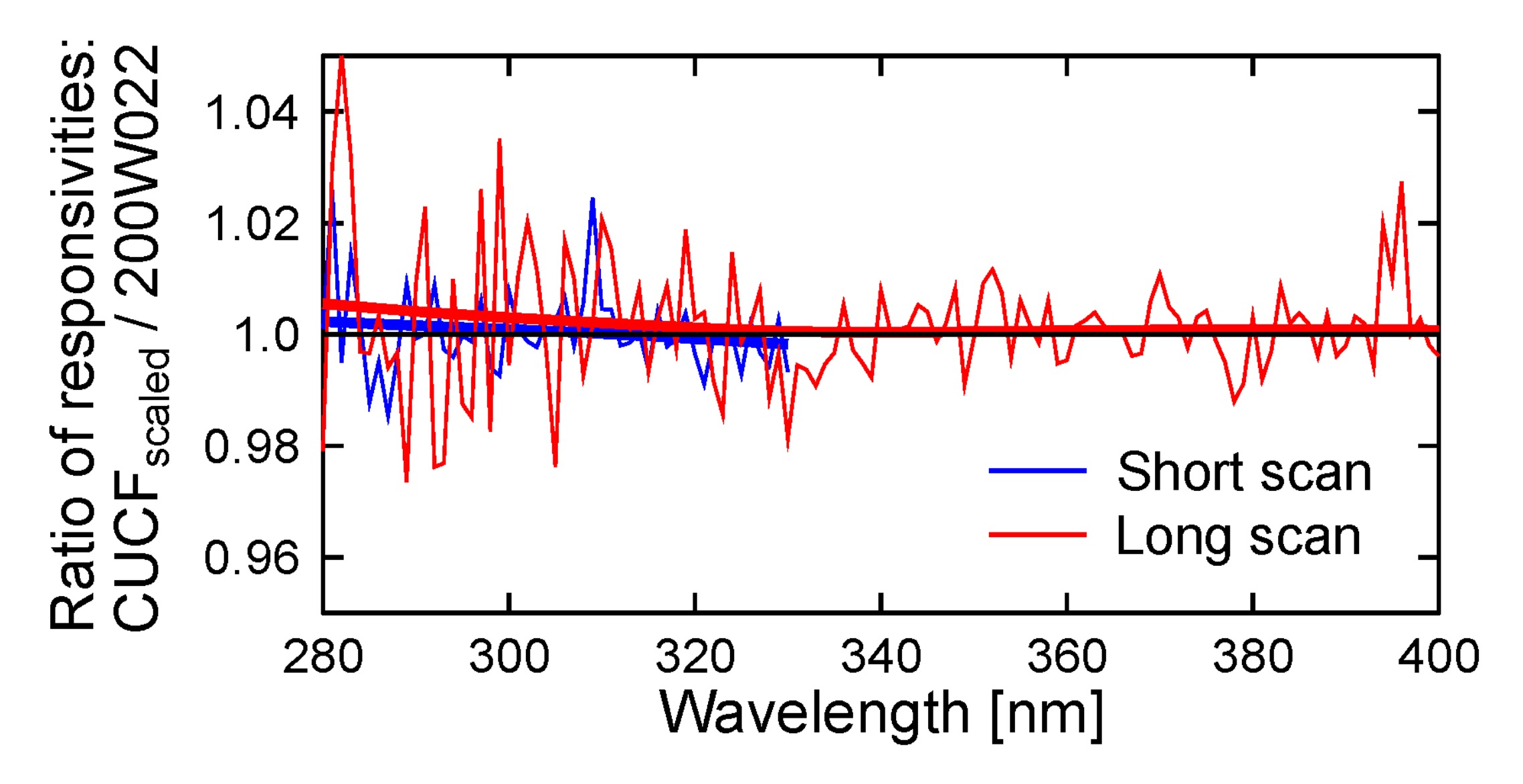 To confirm that the change from the SoSI maintained by OL to the SoSI realized by the CUCF lamps did not incur a step change in solar data, we determined the responsivity of an SUV-100 spectroradiometer located in San Diego using both the CUCF lamps (with their SoSI scaled to NIST1990) and lamp 200W022, which was calibrated by OL on 28 March 2001. Lamp 200W022 is a long-term standard and had only been used 11 times (about 5 h of runtime) since its calibration at OL. The standard protocol of SUV-100 data collection was used, which entails measurements at two different high-voltage (HV) settings of the system’s photomultiplier tube detector. At first, a “short scan” between 280 and 330 nm was performed using an HV of 870 V to optimize the signal-to-noise ratio at wavelengths in the UV-B. Then, a “long scan” between 280 and 600 nm was executed using a lower HV of 700 V to avoid saturation at wavelengths in the visible area. Figure A2 shows the ratio of responsivities (CUCFscaled/200W022) determined with the CUCF lamps (SoSI scaled to NIST1990) and lamp 200W022 for both scan types.