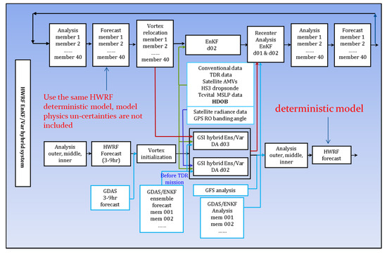 The HWRF DA system is one of the most important components in the operational HWRF. A special vortex initialization procedure was utilized to provide a first guess for data assimilation. The vortex initialization extracts the TC vortex from the HWRF 6 h forecast, and makes an adjustment to its size and intensity according to the storm message files or TC vitals, which is used by the NCEP and many other modeling groups to begin the process of running a hurricane model. The vortex in the 6 h forecast from the Global Data Assimilation System (GDAS) is then removed and replaced the adjusted vortex in the observed location. The technical details of the vortex initialization can be found in Liu et al. (2012) [17] and Tong et al. (2018) [18]. The TC inner-core DA assimilates the observations on top of the results of vortex initialization. Figure 1 describes the dual-resolution self-cycled DA system used in H217. The DA system used in the operational HWRF is a GSI-based hybrid EnKF Variation system, which uses either the 6 h forecast 80-member ensemble from the GDAS, or the 6 h forecast 40-member ensemble generated by the HWRF (self-cycled DA) to calculate the model background error covariance matrix. Due to the computer resource limit, the HWRF 40-member self-cycled DA system is only run for high priority TCs targeted at the National Oceanic and Atmospheric Administration (NOAA) P3 Tail Doppler Radar (TDR) missions. Details of the HWRF DA system can be found in Lu et al., 2017 [22] and Tong et al., 2018 [18]. An ideal TC inner-core DA system should include: 1. flow-dependent background error covariance matrix that is generated using the same dynamic model system; 2. the mass-wind balanced initial conditions to avoid model initial shock; 3. An ensemble that represents the realistic model uncertainties and forecast errors. The first two issues listed above have been addressed in H217 by implementing the dual-resolution self-cycled DA system and blending DA increments with vortex initialization in the inner-core area for storms with a maximum 10 m wind speed greater than 65 kt (Biswas et al., 2017 [23]). A realistic ensemble forecast error sampling will lead to a better estimate of model forecast background error covariances, hence a more realistic TC initial analysis. In H217, only uncertainties from model initial conditions, such as the TC initial intensity, initial position and initial large-scale flows, are accounted for through EnKF, while the uncertainties due to model physics are not considered.