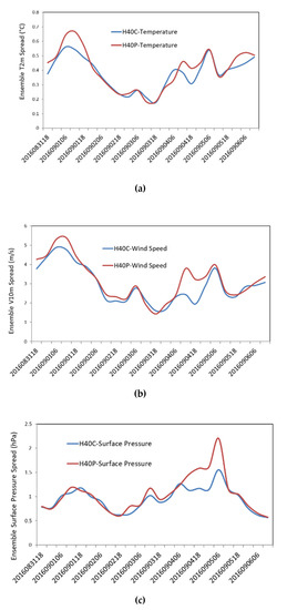 Comparisons of the spatially domain-averaged ensemble spread of (a) 10 m wind, (b) 2 m temperature, and (c) the mean sea-level pressure between the H40C (blue line) and H40P (red line), for Hurricane Hermine, 2016.