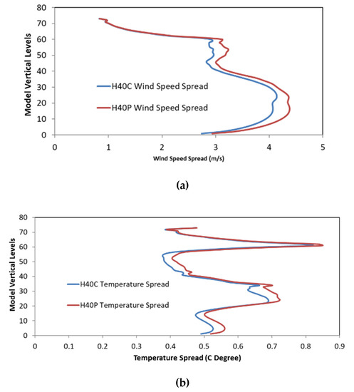 Comparisons of the vertical profiles of the domain-averaged ensemble spread of (a) the wind speed, and (b) the temperature, averaged over all cycles, between H40C (blue line) and H40P (red line), for Hurricane Hermine, 2016.