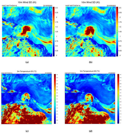 Comparisons of the ensemble spread between H40C (left) and H40P (right). The 10 m wind speed ensemble spread from H40C (a) and H40P (b); and the 2 m temperature ensemble spread from H40C (c) and H40P (d) for Hurricane Matthew, 29 September 2016, 00:00 Universal Time Coordinated (UTC).