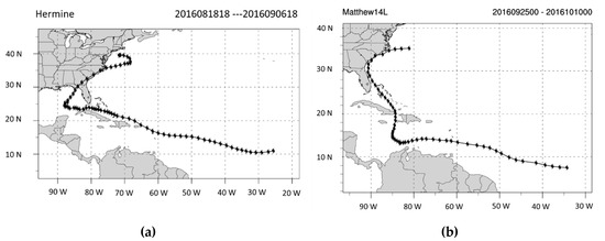 Observed hurricane tracks of Hermine (a) and Hurricane Matthew (b), 2016, storm center locations plotted every 6 h.