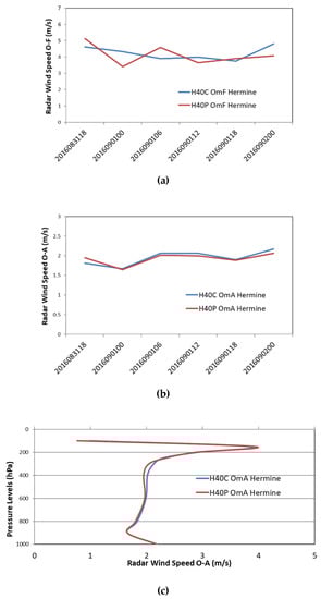 Comparisons between the H40C (blue) and the H40P (red) of (a) the TDR radial velocity observation-minus-first-guess (OmF), (b) the TDR radial velocity OmA, and (c) the TDR radial velocity average of the Observation-minus-Analysis (OmA) vertical profiles, for Hurricane Hermine, 2016.