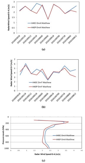 Comparisons between the H40C (blue) and the H40P (red) of (a) the TDR radial velocity OmF, (b) the TDR radial velocity OmA, and (c) the TDR radial velocity average of observation minus Analysis (OmA) vertical profiles, for Hurricane Matthew, 2016.
