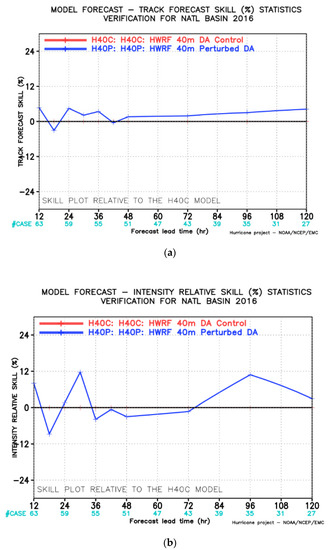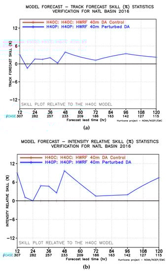 Forecast skill improvements of the experiment with the (H40P) and without the (H40C) stochastic model physics in the self-cycled DA, for the track (a) and intensity (b) forecasts, TDR storms only, Hurricane Hermine and Matthew, 2016.