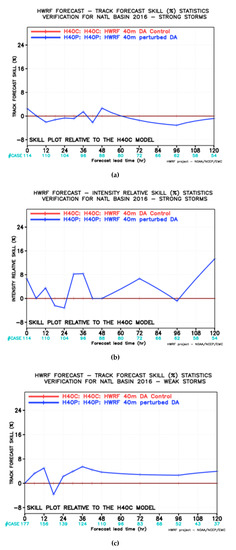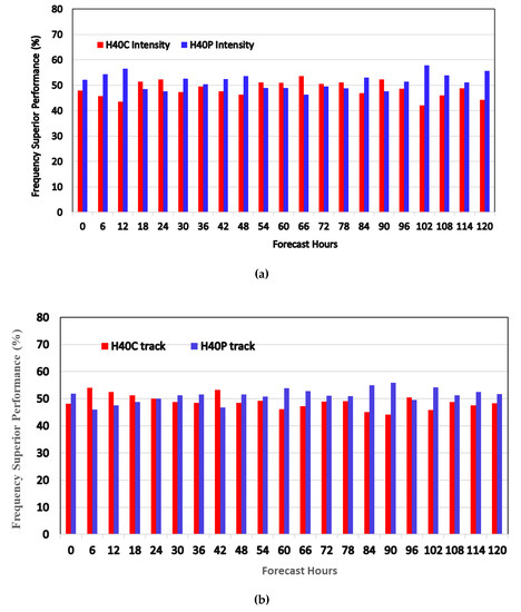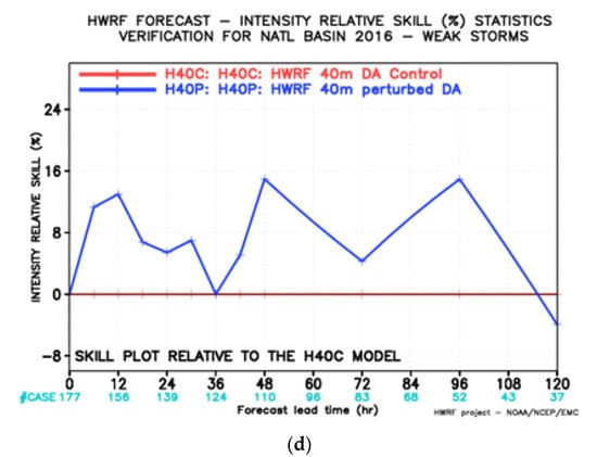 where EH40C and EH40P denote the forecast errors from the H40C and H40P experiments, respectively. A positive (negative) value represents a smaller (larger) forecast error and a better (worse) performance compared to HWRF. Figure 8 indicates that the addition of stochastic physics in the HWRF DA had a neutral to slightly positive impact on the track forecast skills, with one exception of degradation at 18 h. There was about an 8% improvement at all lead times on the intensity forecast skills. The forecast skill improvements in H40P in general merited the proposed scheme to be included in the 2018 version of the operational HWRF upgrades. In order to ensure the robustness of the track and intensity improvements in H40P, Figure 9 compares the frequency of the superior performance (FSP) between the H40C and H40P, which further confirms that H40P generally outperforms H40C in terms of track and intensity forecasts, especially in the later forecast hours. The improvements of the track and intensity forecasts of H40P for the individual storms/cycles are examined. Figure 10 is an example of the 5-day track and intensity forecast comparisons between H40C and H40P for Hurricane Matthew 14 L, 00:12 UTC 28 September 2016. It shows that the track forecasts of H40P are comparable to that of H40C, but the H40P track is smoother and realistic. The intensity forecasts of H40P shows a clear advantage over H40C, especially during the Rapid Intensification period forecast hours of 48–72 h. The stratified verification was also performed for the initially weak (<50 knots) and strong (≥50 knots) storms. The results show that compared to the control experiment (H40C), the stochastic physics DA experiment (H40P) had a more positive impact on the track forecast skills (~3%) and the intensity forecasts skills (average ~8%) for the weak storms (Figure 11c,d) than that for the strong storms (Figure 11a,b), whose impacts were basically from a neutral to slightly negative impact.