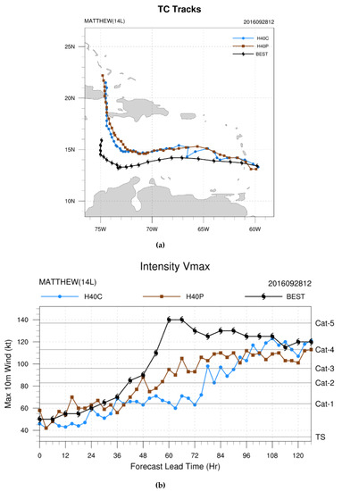 An example of 5-day track (a) and intensity (b) forecast comparisons between the H40C and the H40P for Hurricane Matthew 14 L, 00:12 UTC 28 September 2016. TC: Tropical Cyclone.