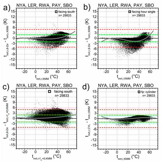 Because they are based on the same measured radiant fluxes, differences in Tmrt,r,6-Dir and Tmrt,r,KMM can only arise from the anisotropic radiant parameters and the slightly differing fp (see Figure 1). Therefore, the evaluation of differences is restricted to daylight hours.